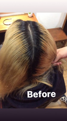 We bleached her dark roots color, and used toner to get rid of the yellow color. If we had’t used toner, the color would’ve been very yellow blonde.