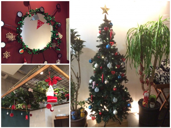 クリスマスツリーとシャンプー台の上、入り口、お手洗いなど