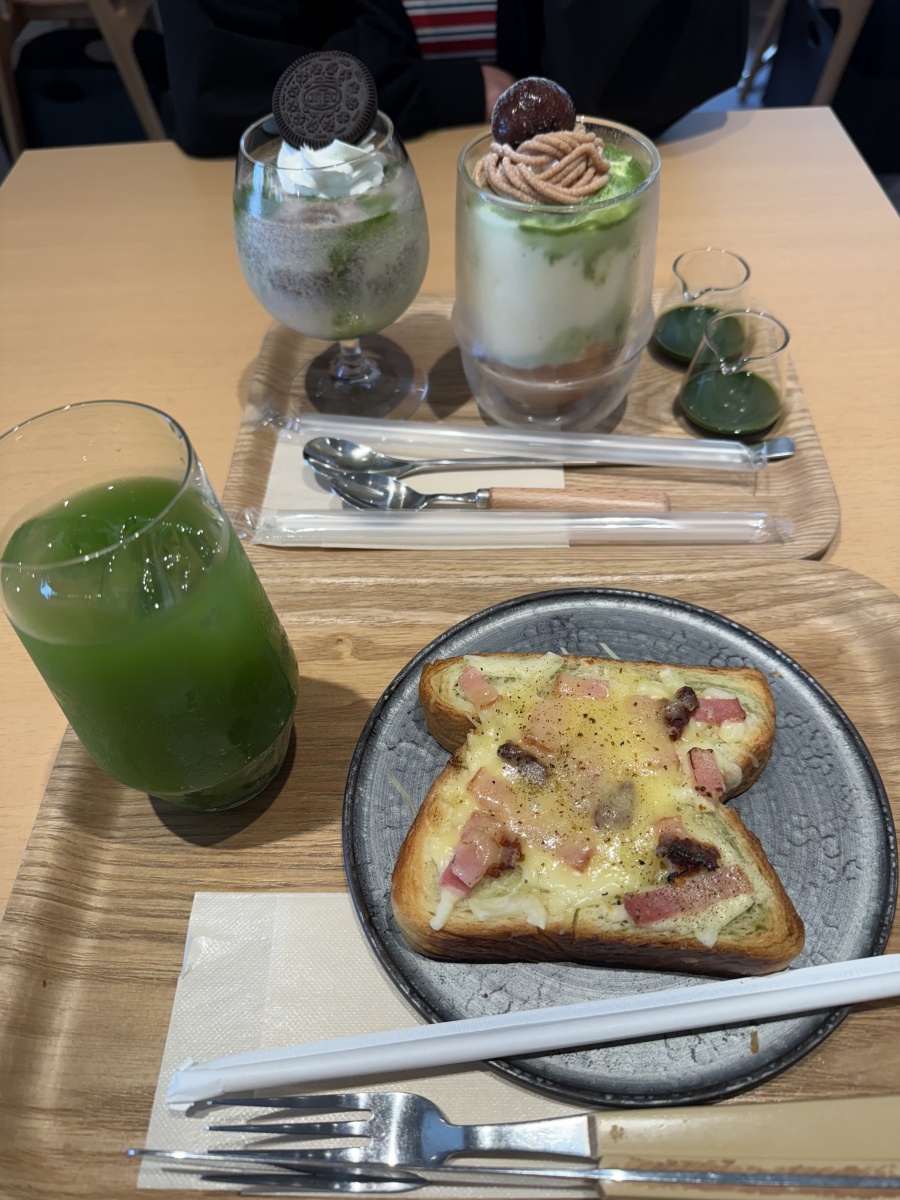抹茶が使われたデニッシュブレッドのトーストに抹茶ウォーター、抹茶のデザートなど、抹茶づくしの食事を楽しむことができました🍵