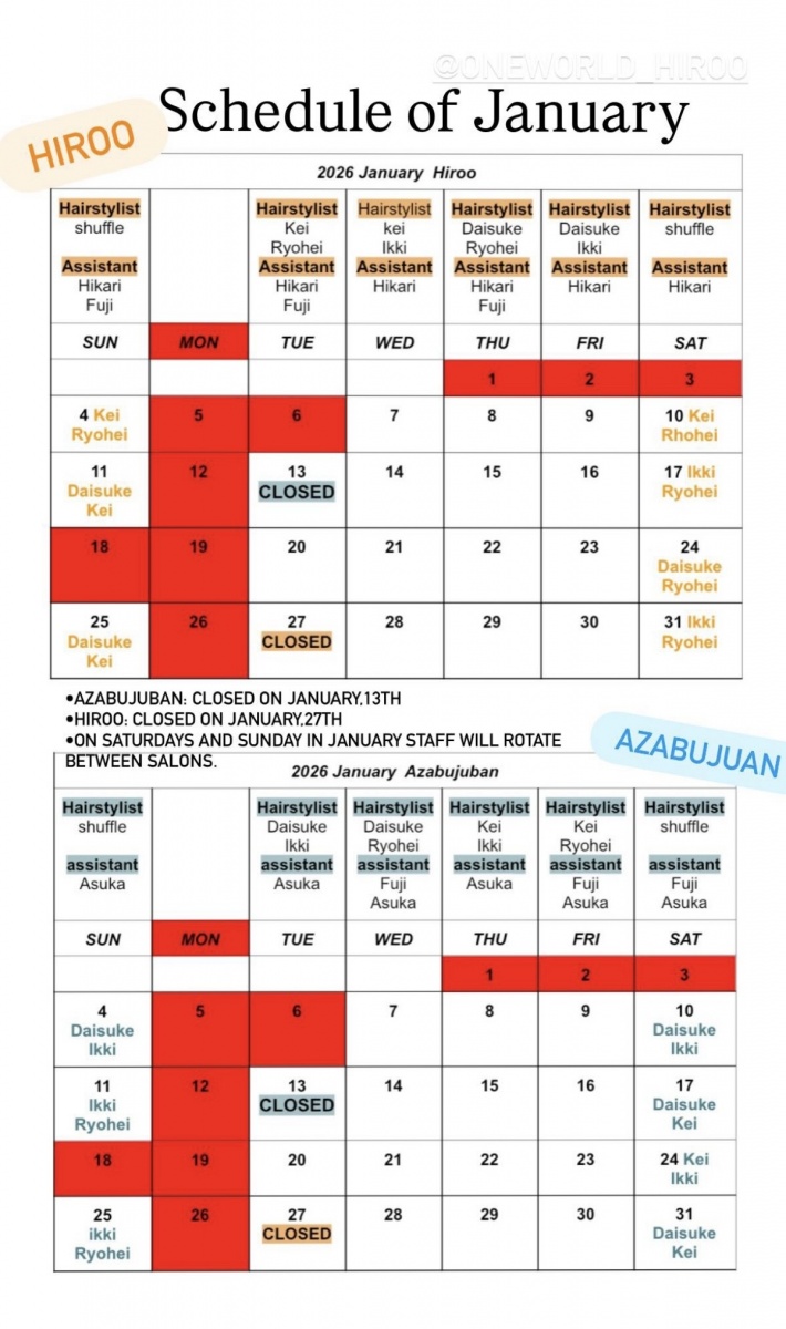 平日 Weekday 10:00~20:00(最終受付 Last Appointment>>Cut 19:00, Color/Perm Ask)土日祝日 Saturday,Sunday,National Holidays 9:00 ~18:00(最終受付 Last appointment>>Cut 17:00,Color/Perm ask)