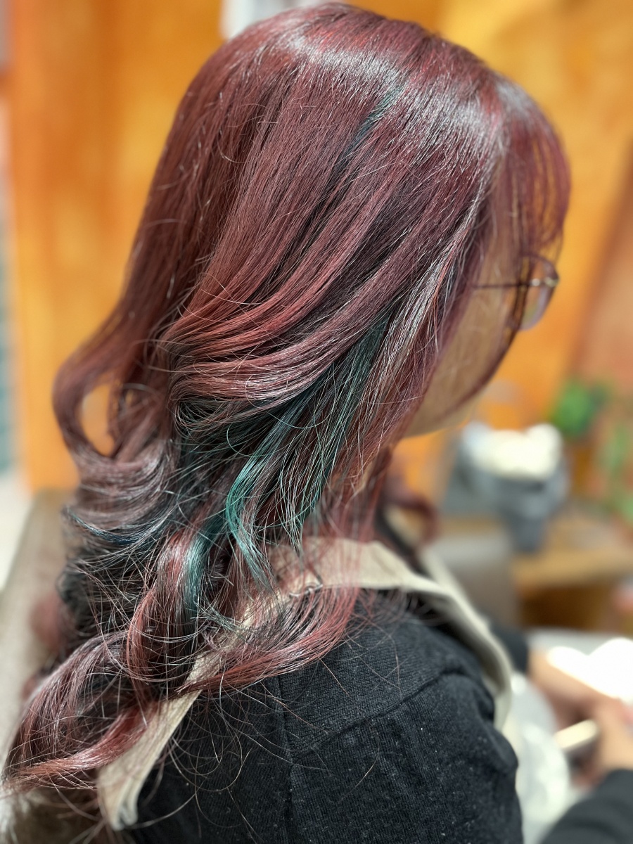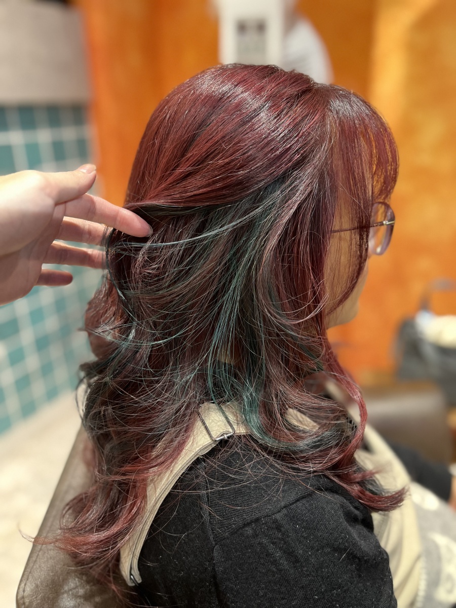 ブリーチをしてから鮮やかなカラーをやると、より発色がよくなり、綺麗な色になります。
