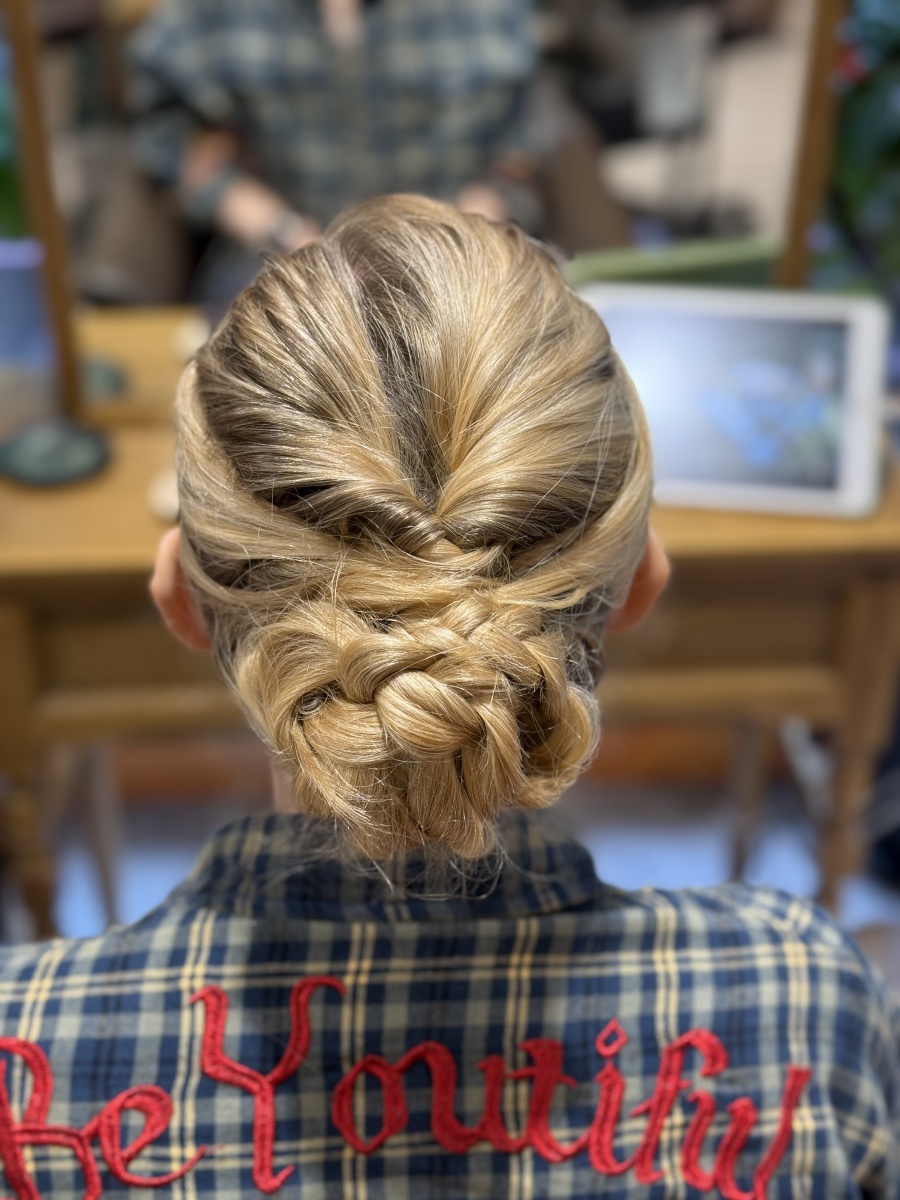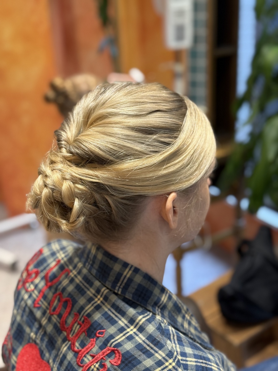 下の方は三つ編みやねじり編みを混ぜてお団子にしてまとめ、華やかな仕上がりにできたと思います!