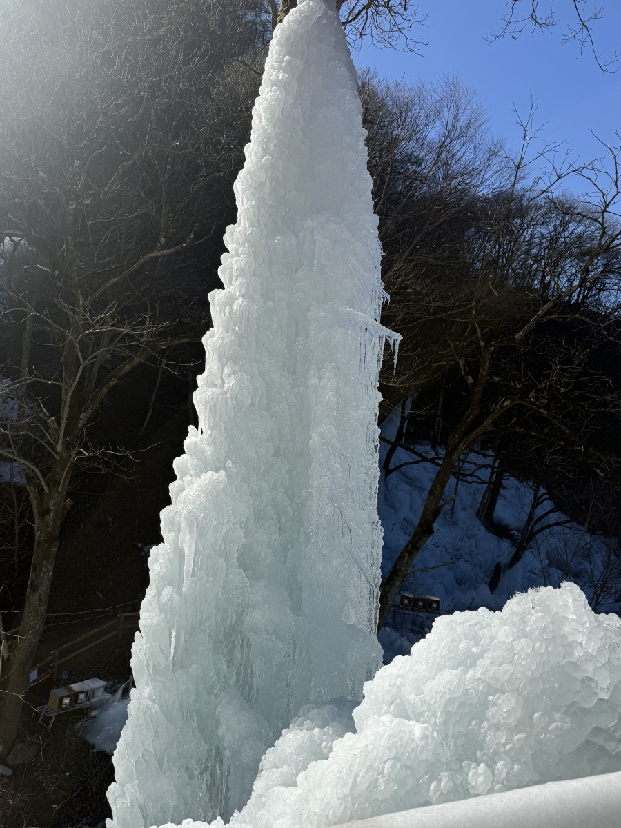 東京に比べて涼しく、一部雪も少し残っていましたが、快晴だったので氷柱に日光が当たった様子が綺麗でした。
